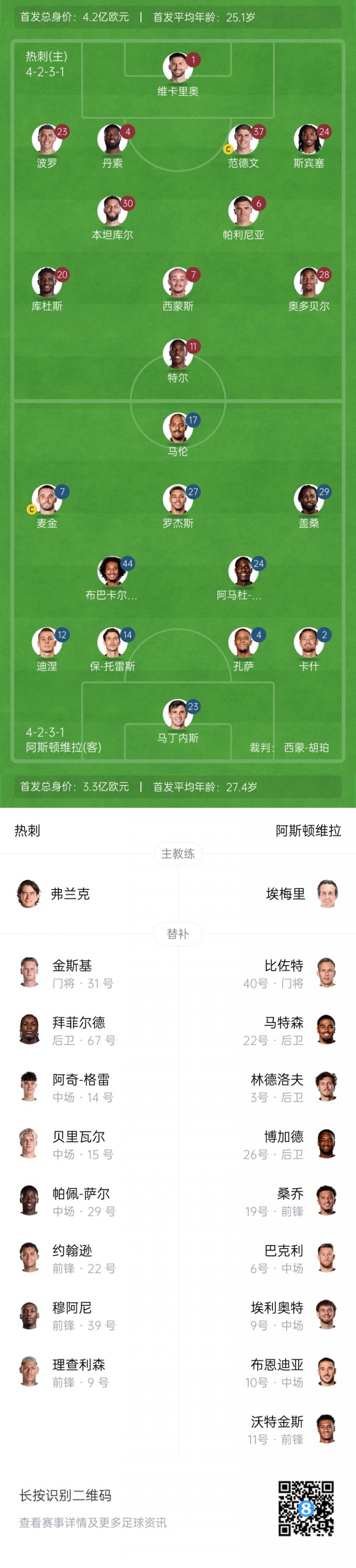 2025-10-20 00:20:59热刺vs维拉首发:特尔、库杜斯先发,西蒙斯登场,桑乔替补待命