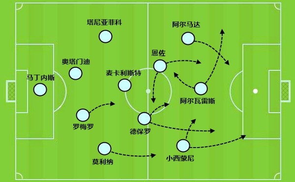 通过他的大范围跑动,不只是回撤还要拉边,带来频繁的换位。恩佐在前腰位置同样有着大量的跑动,给阿尔马达内切或者是小西蒙尼前插带来机会。