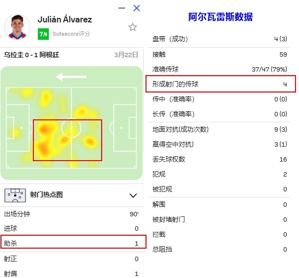从统计数据可以看到,阿尔瓦雷斯全场只射门1次,却送出4次关键传球,最终带来一记决定胜负的助攻。