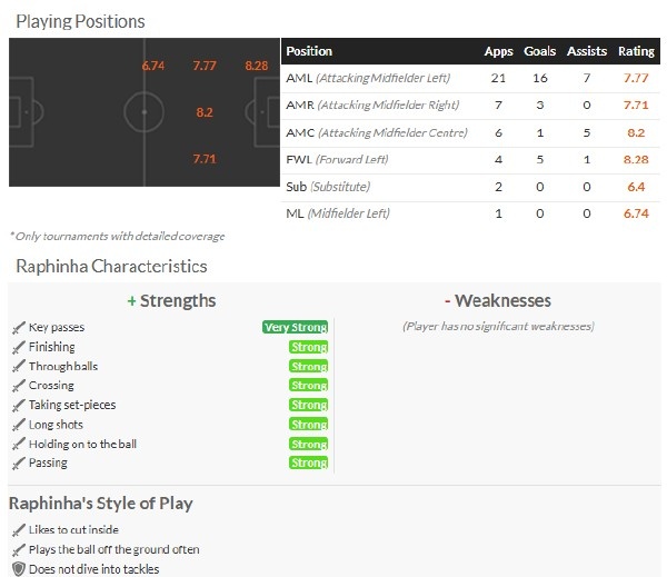 拉菲尼亚本赛季在巴萨的表现非常出色,甚至被视为金球奖最热门的候选人之一。问题是,他在巴萨踢得好,是因为被当做攻城拔寨的前锋来使用。