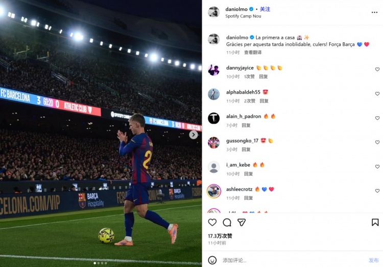 2025-11-23 16:01:20已加盟15个月!奥尔莫社媒纪念:诺坎普的首场比赛,感谢球迷支持